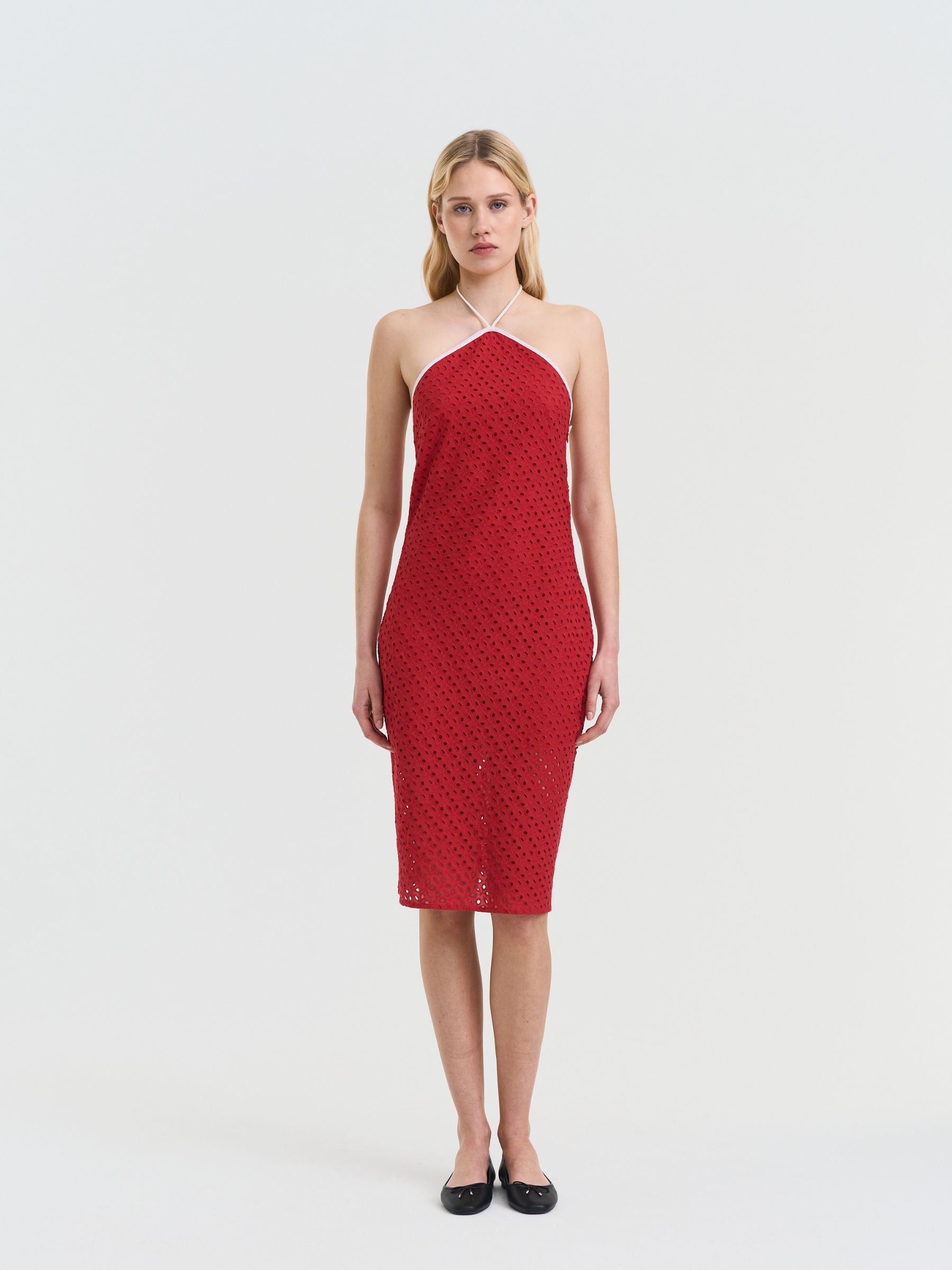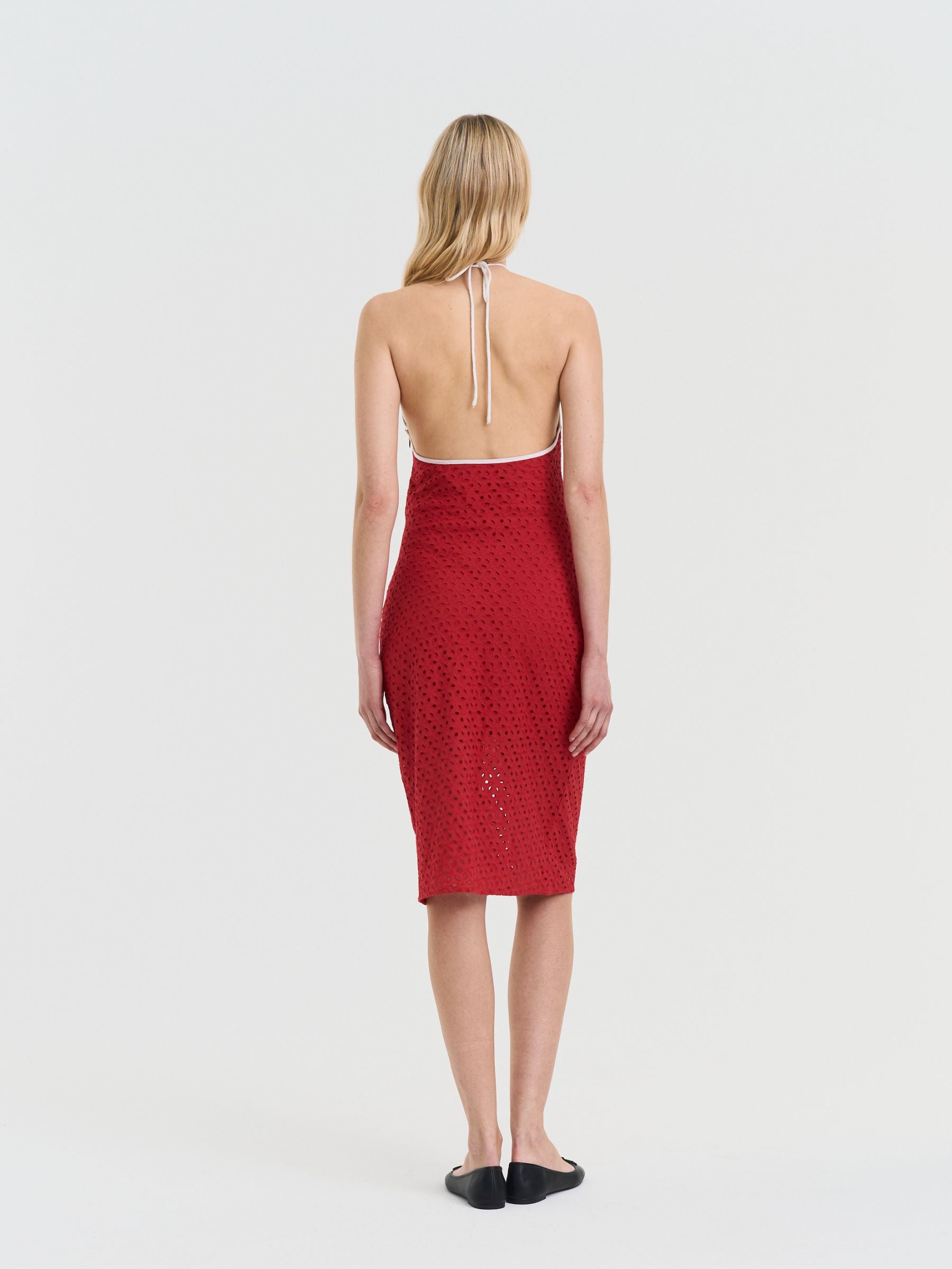 Effortlessly chic, turn heads in this striking red halter dress made from lightweight broderie anglaise cotton. Whether you're strolling through city streets or headed to rooftop drinks, this dress makes a confident, stylish statement.