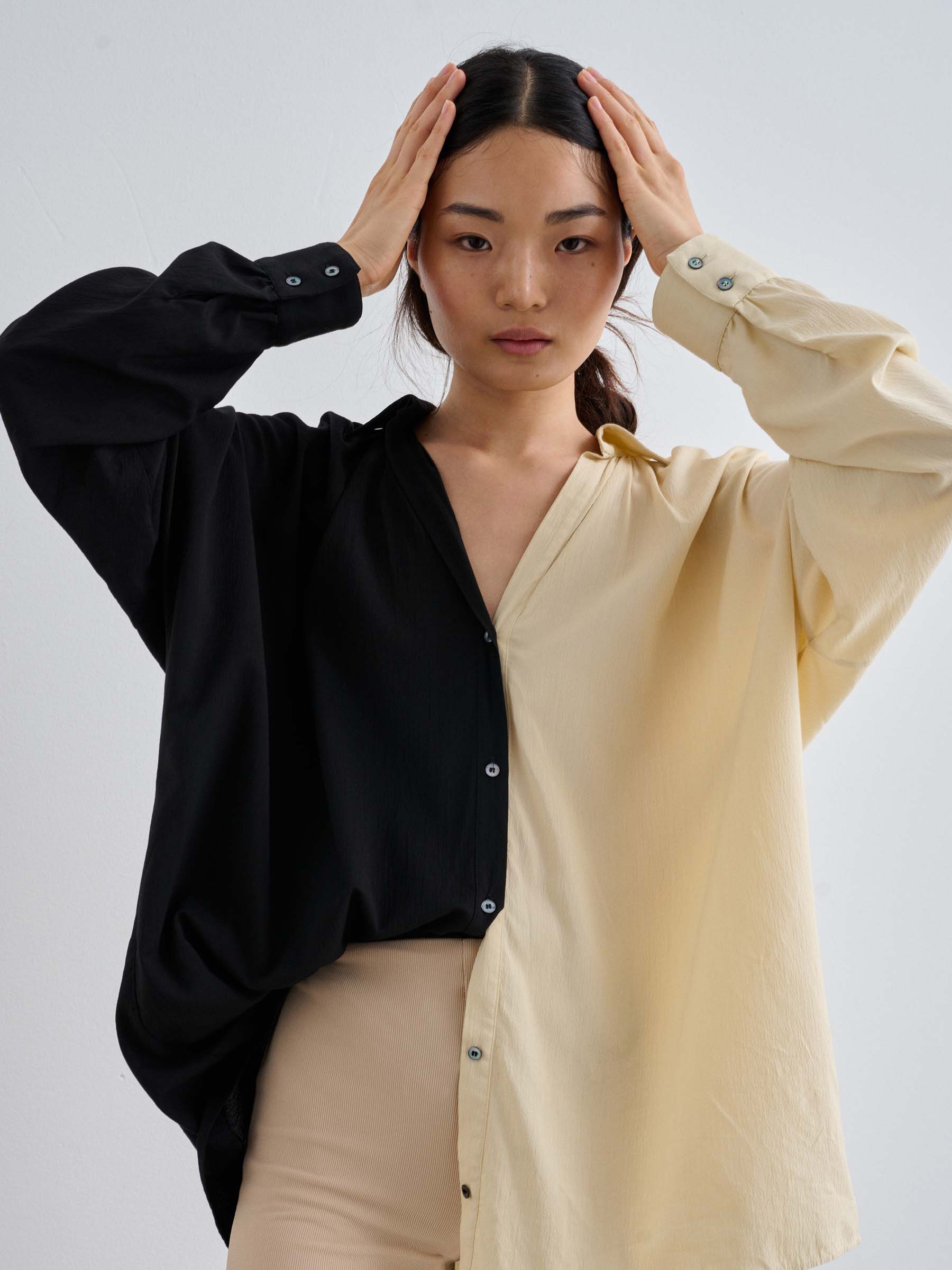 Made from an eco-friendly viscose crepe fabric, the womens' shirt Caia is designed for an oversized fit with dropped shoulders, a buttoned placket and cuffs, and a rounded hem that dips at the back.