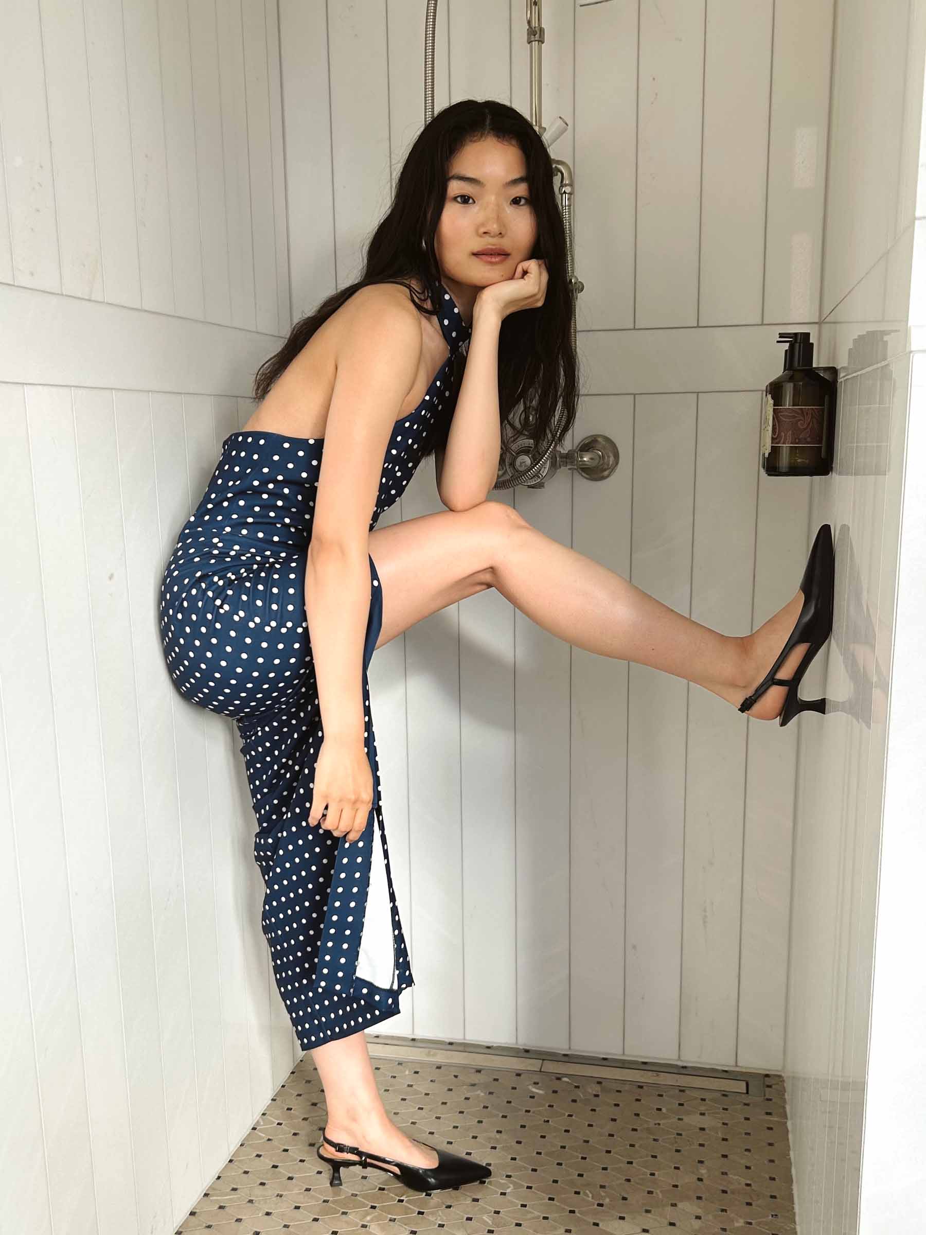 Turn heads in this elegant navy halter midi dress, adorned with classic white polka dots. Featuring a sleek high neckline, an alluring front slit, and a figure-skimming silhouette, this dress is perfect for chic evening or daytime events. Crafted from lightweight fabric for effortless movement, it pairs beautifully with heels for a timeless and sophisticated look.