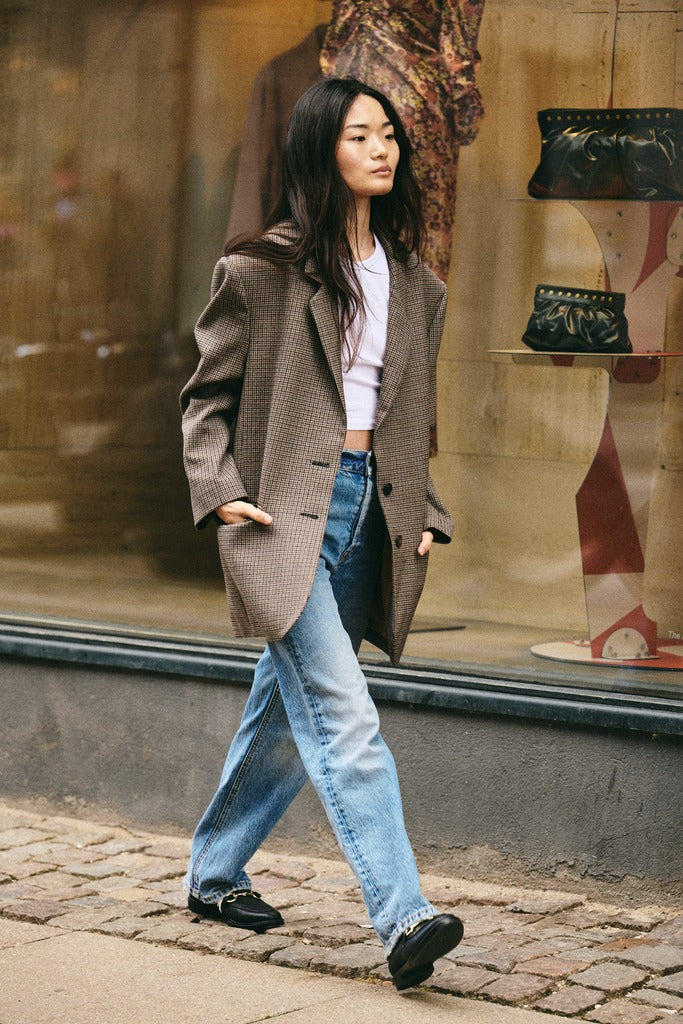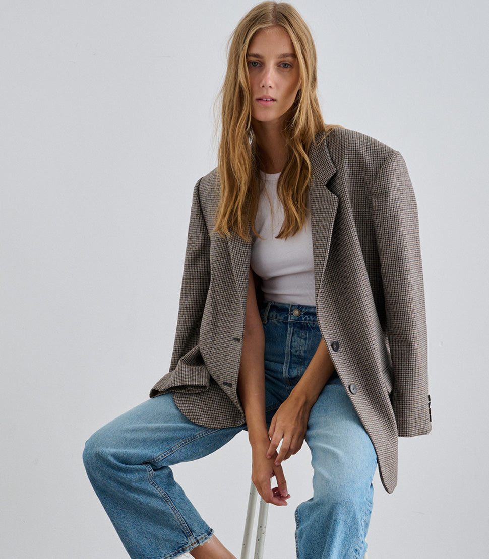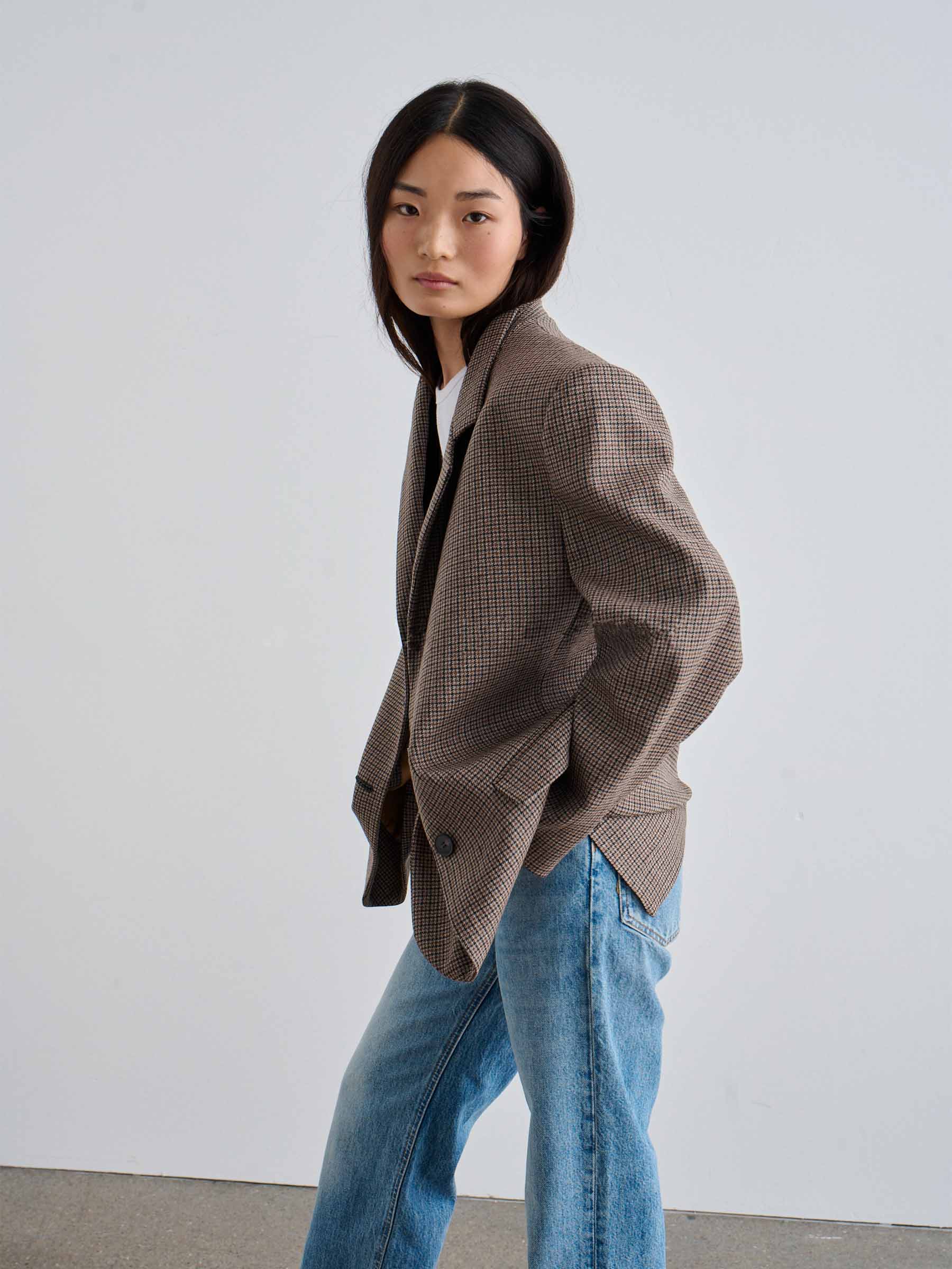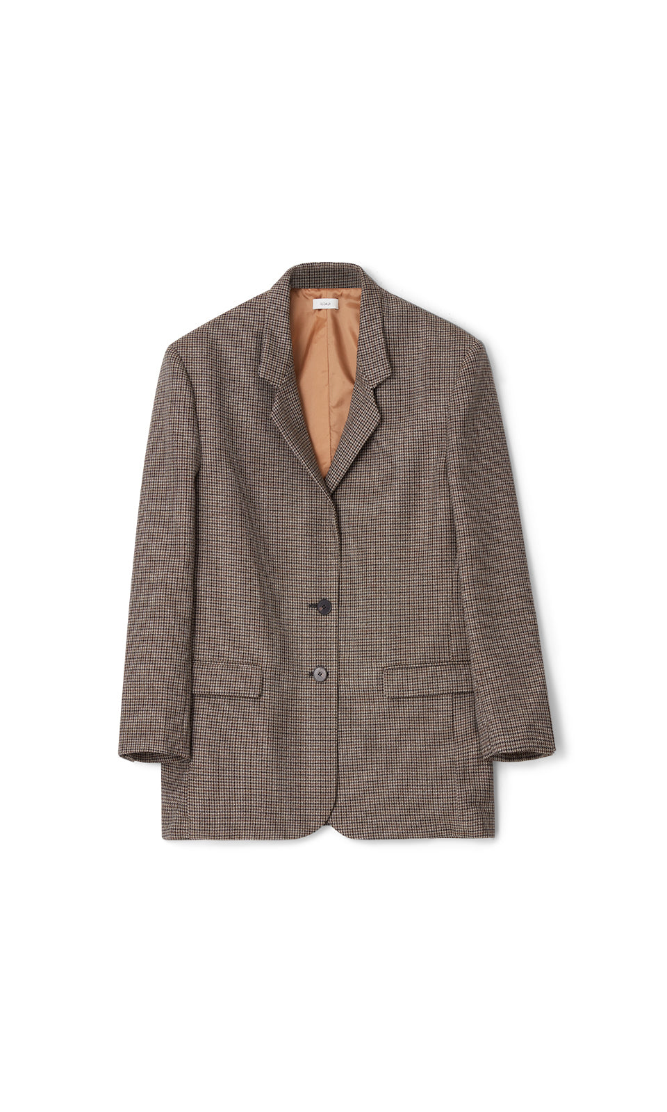 The Gatsby blazer, woven from a mid-weight wool fabric. Inspired by classic menswear tailoring, it’s designed for an oversized but well-tailored fit, a classic unstructured blazer with internal pockets, padded shoulders and a straight hem.
