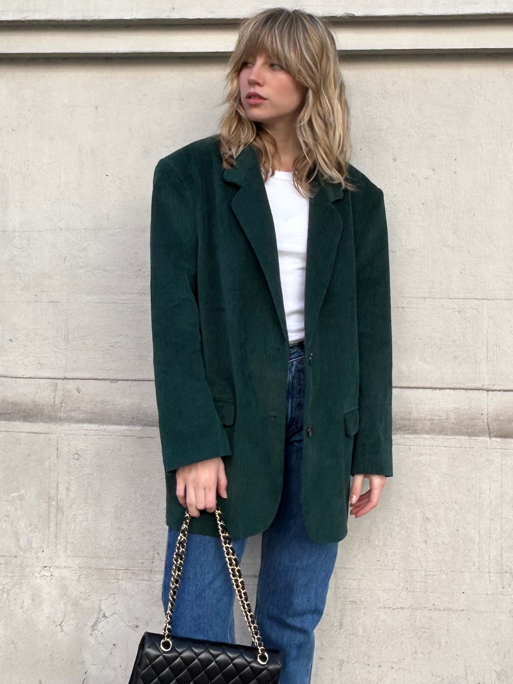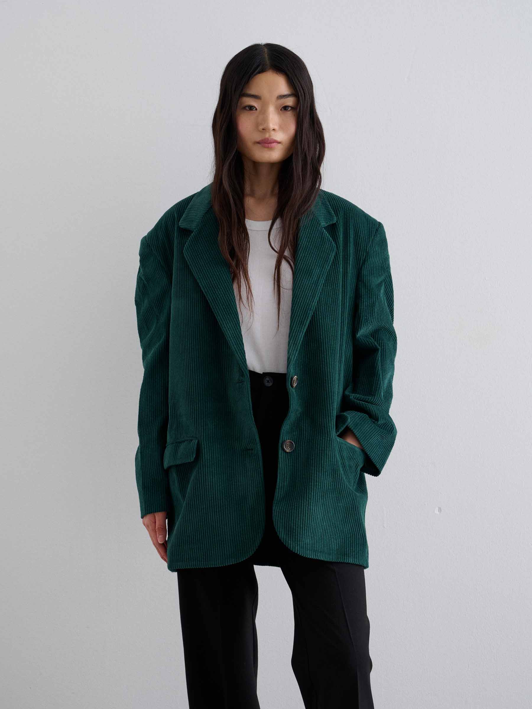 Introducing our Everyday Blazer in a dark green colour with a gorgeous corduroy fabric. Crafted to grace your closet for years on end. Tailored for an oversized fit, padded shoulders and pockets, it seamlessly complements every piece in your wardrobe.