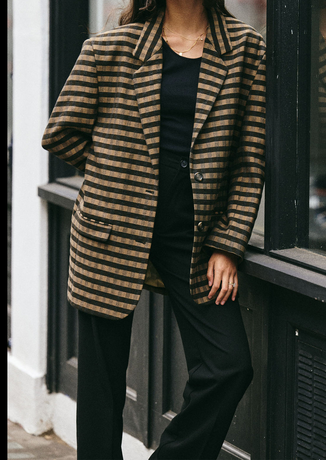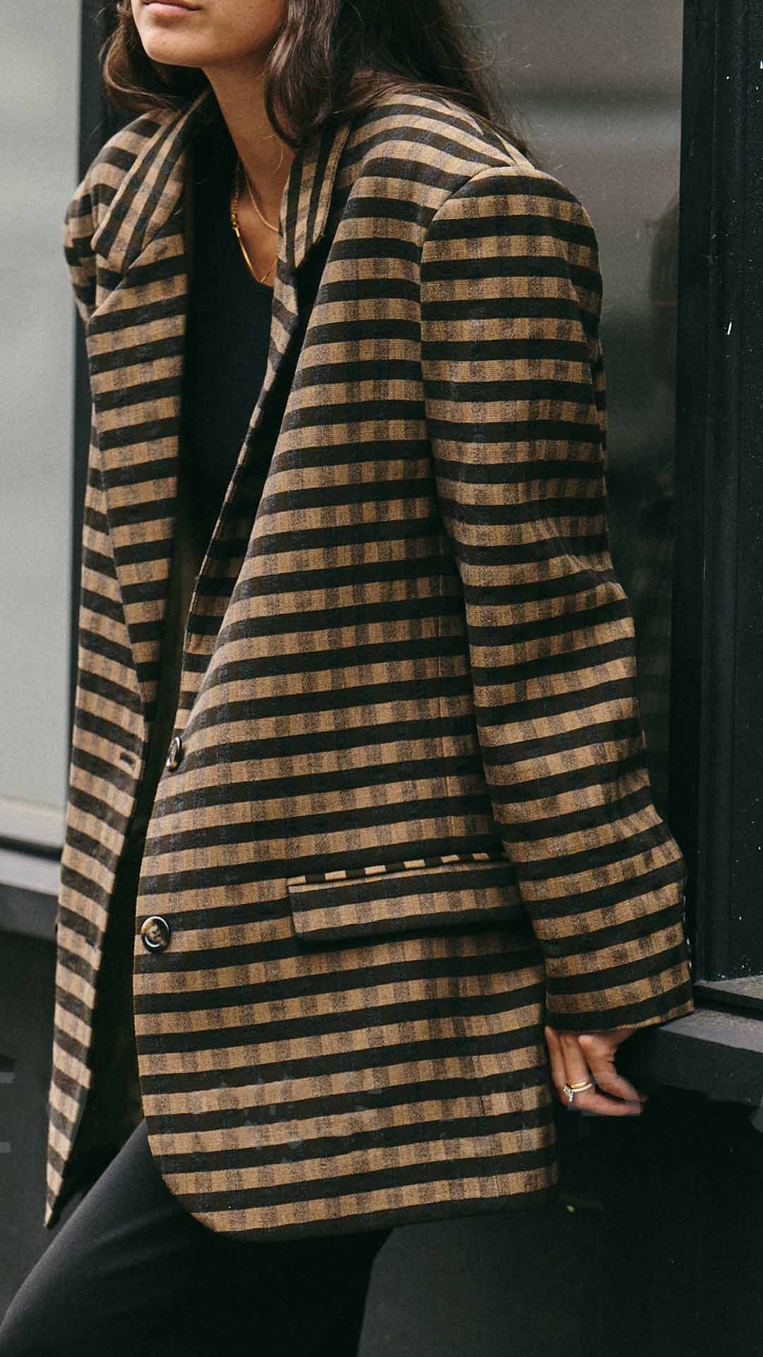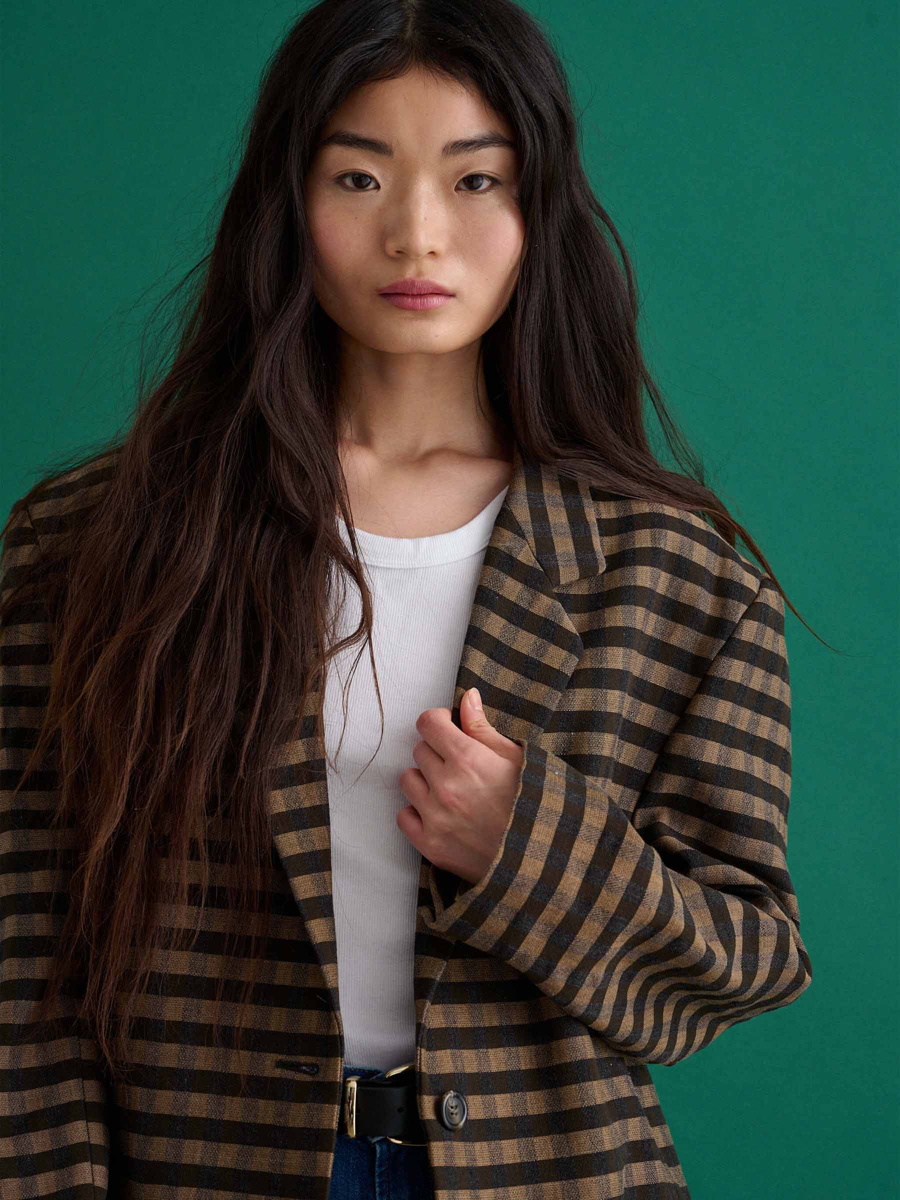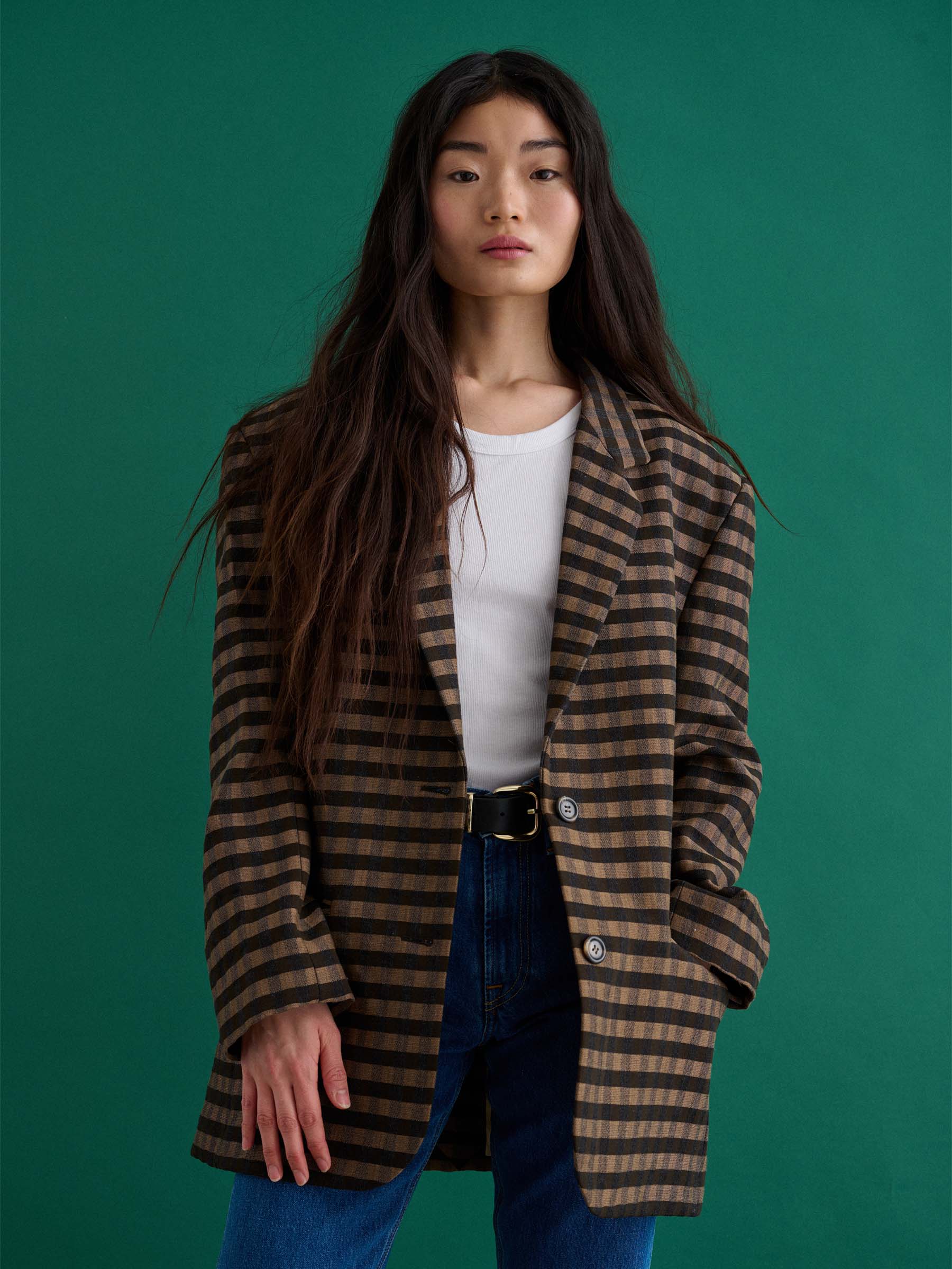 Featuring a sophisticated contemporary print and crafted from a blend of mid-weight wool and cotton that resists wrinkles, this plaid blazer is sure to capture attention. It’s designed for an oversized but well-tailored fit, with structured shoulders, internal pockets and a straight hem.