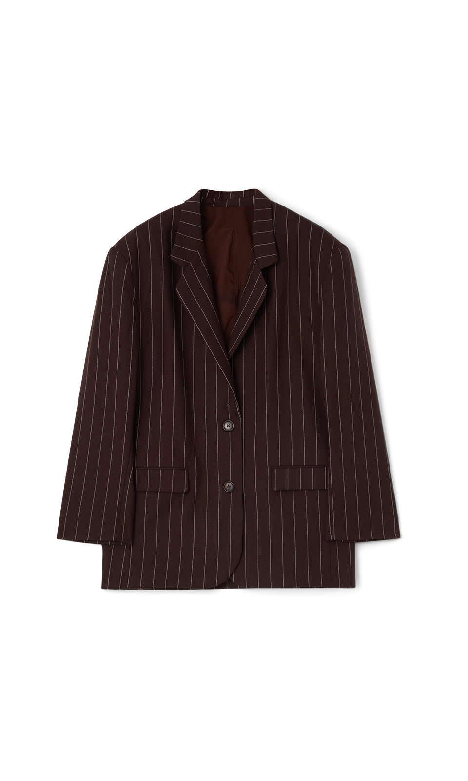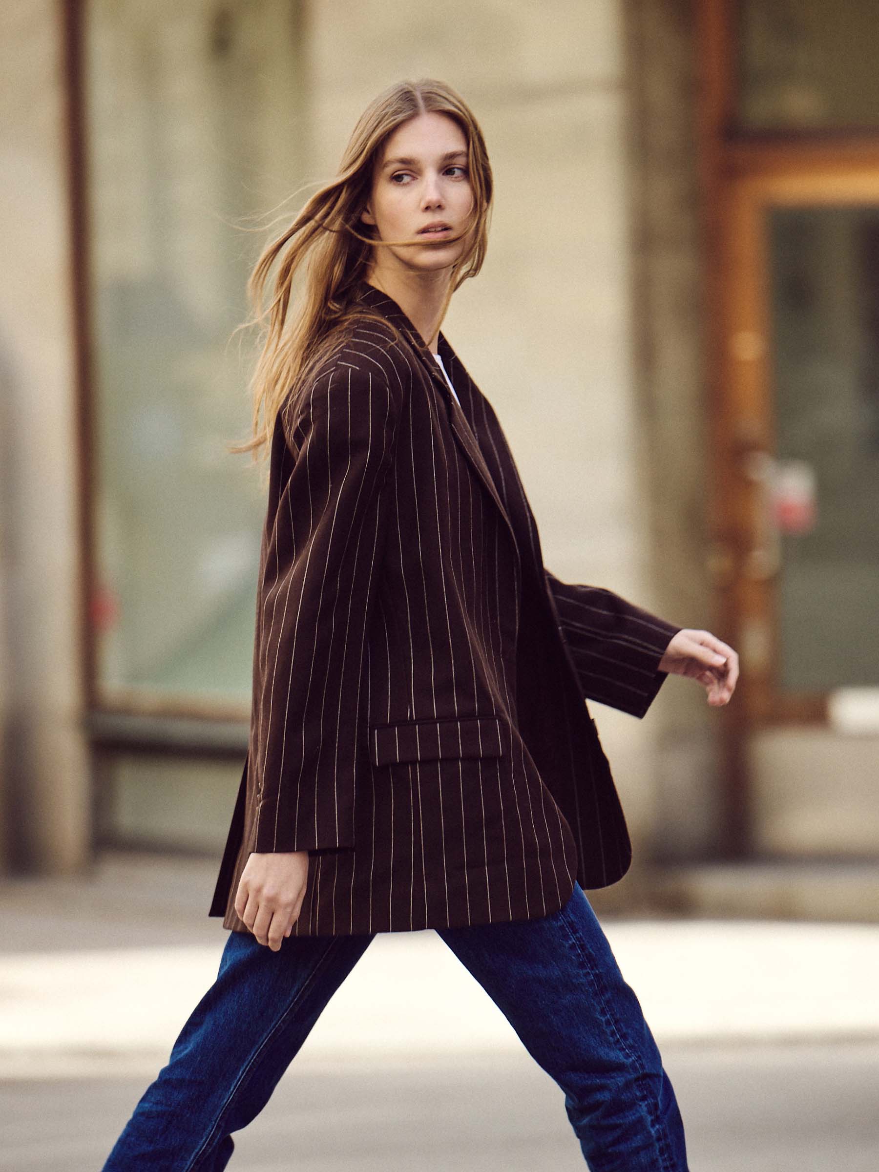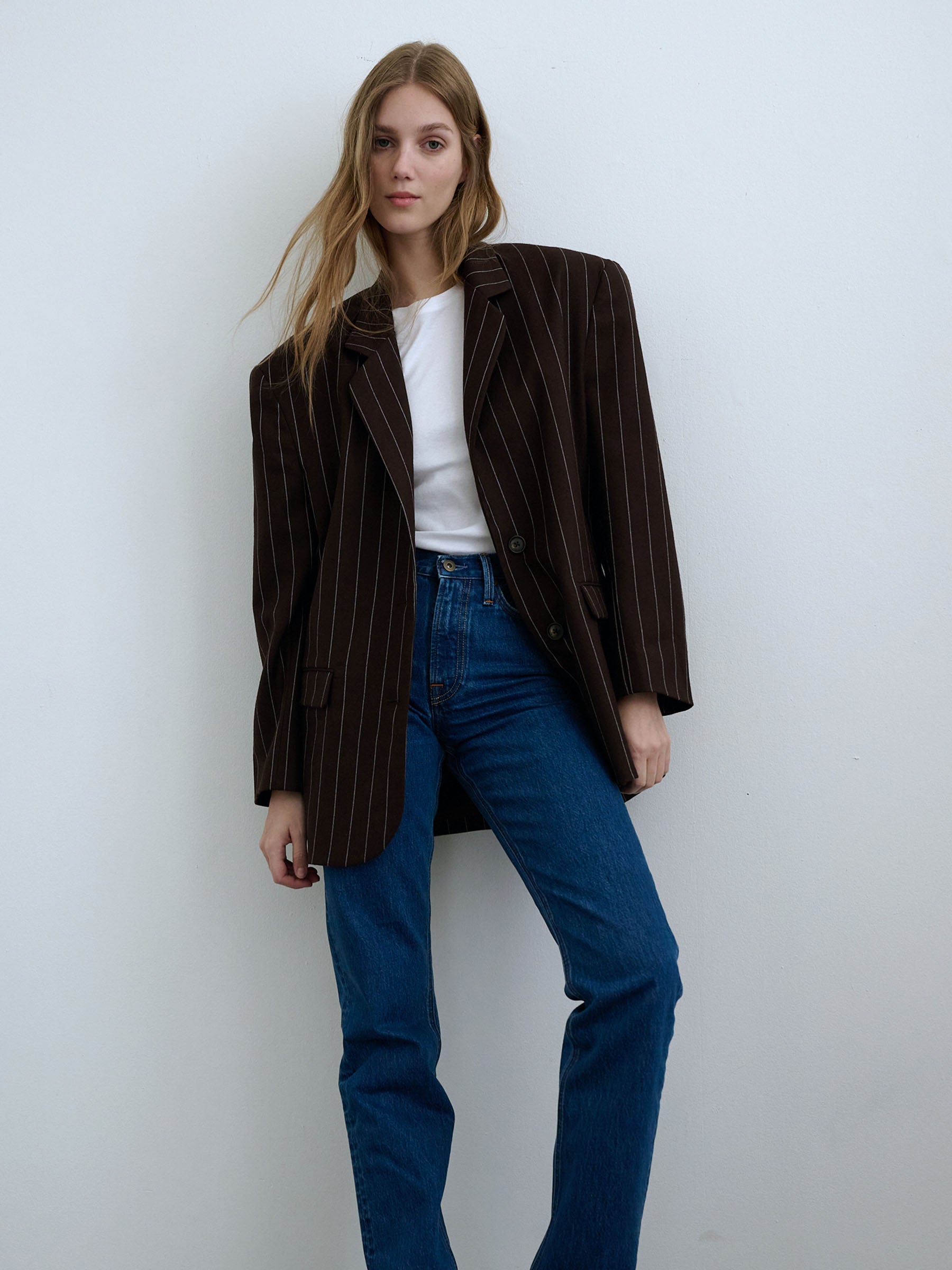 Introducing our Everyday Blazer in a brown colour with a subtle white pinstripe pattern. Crafted to grace your closet for years on end. Tailored for an oversized fit, padded shoulders and pockets, it seamlessly complements every piece in your wardrobe.