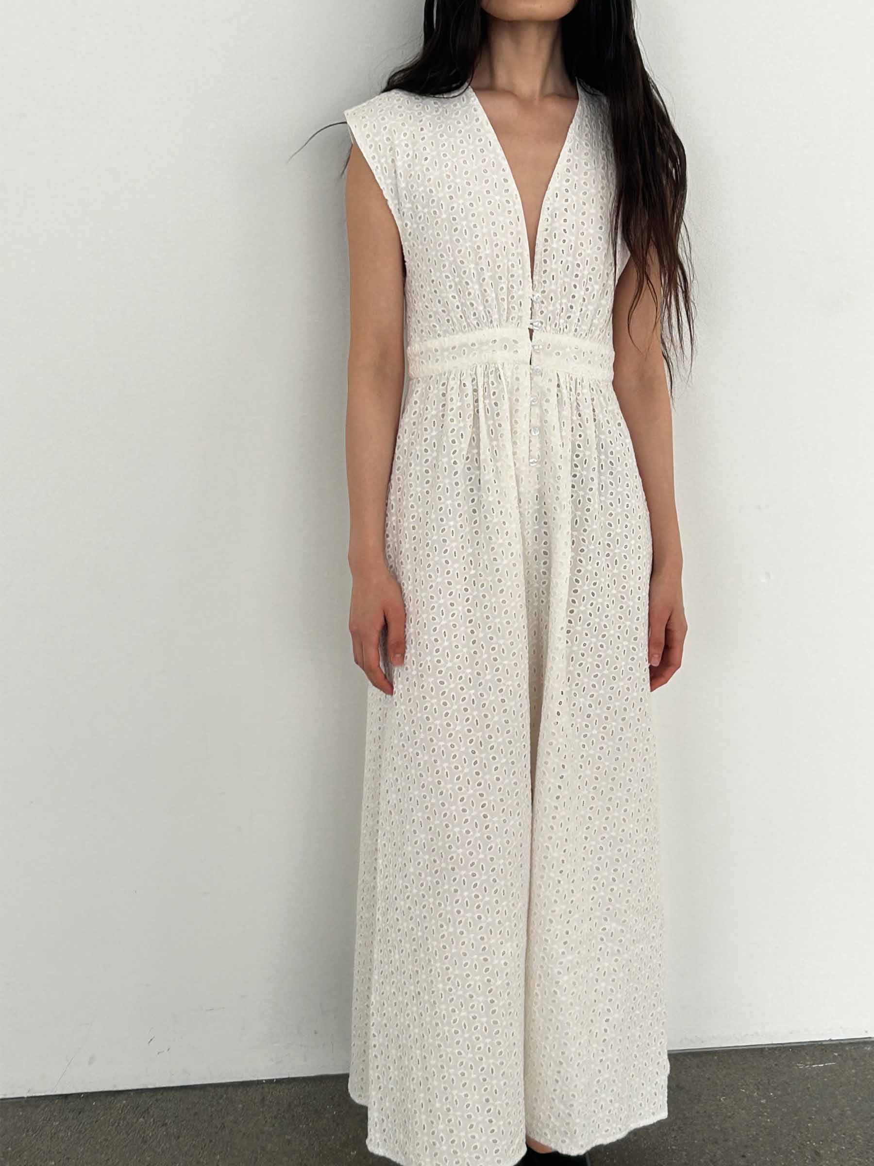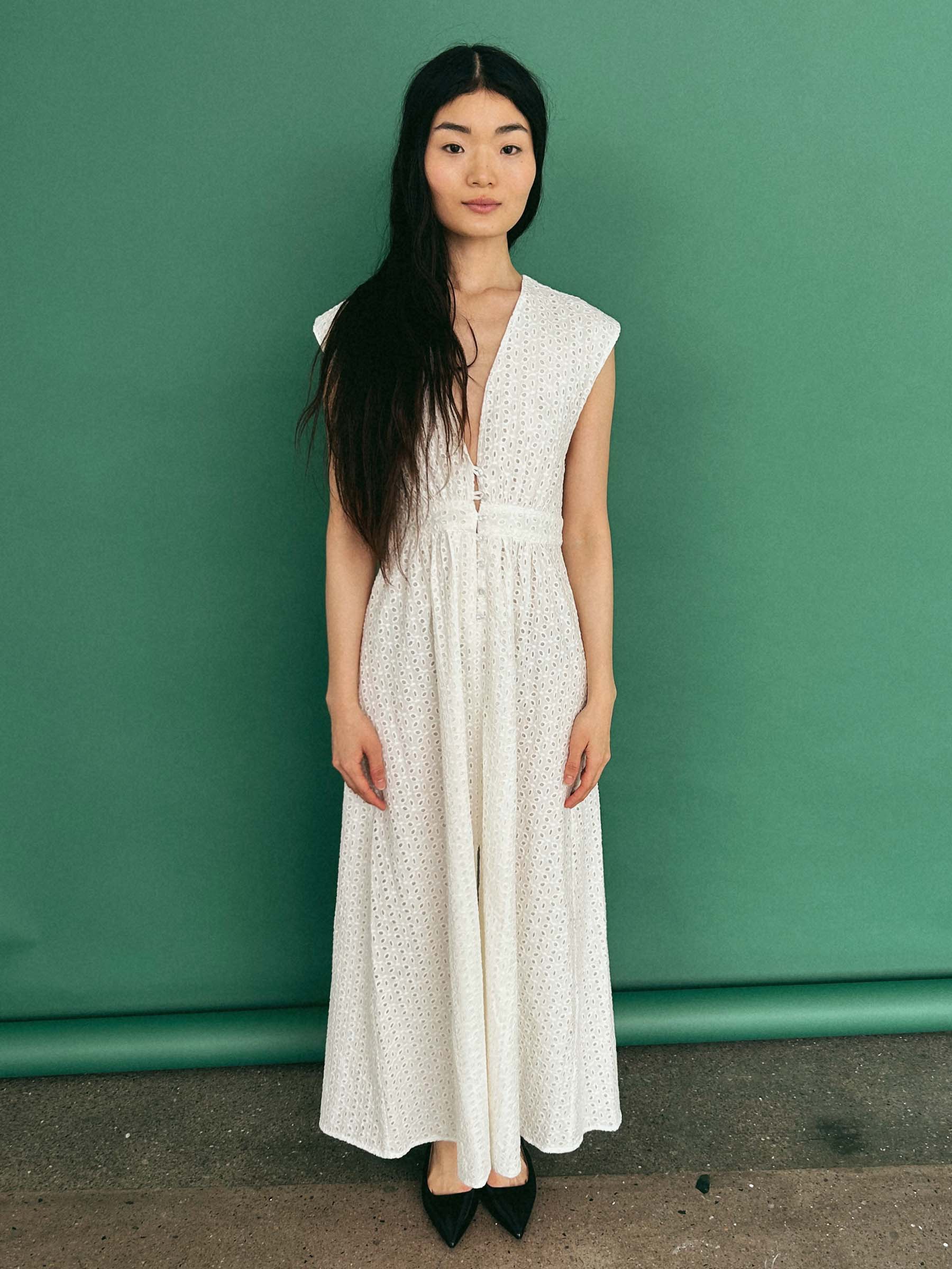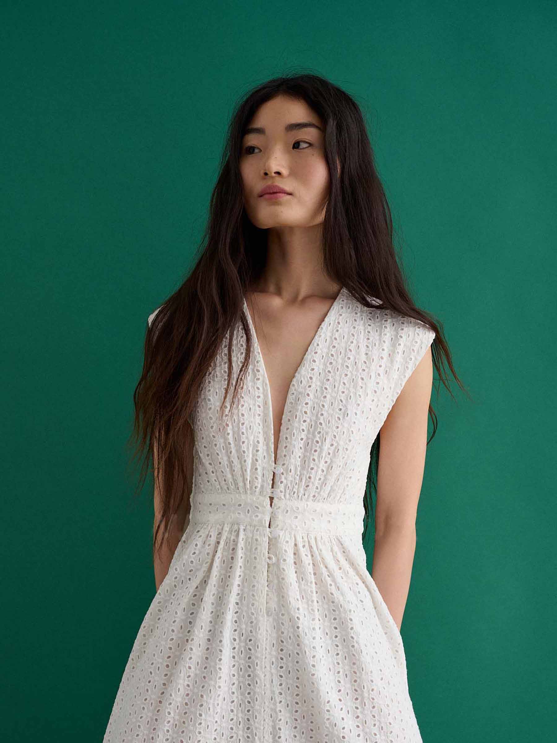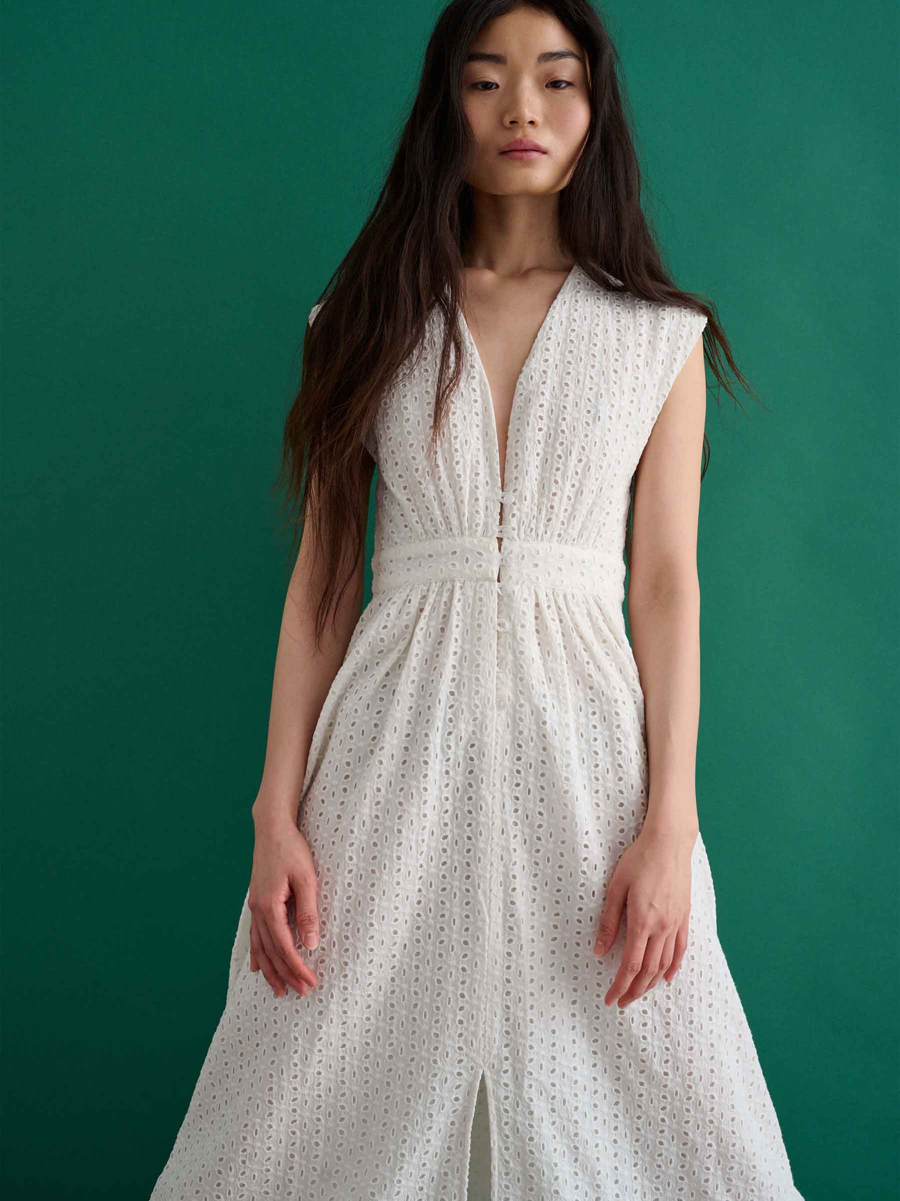 The Sienna dress is a true classic. Crafted from a soft cotton broderie anglaise fabric, featuring a flattering V-neckline with buttons, a subtle cinched waist and a midi skirt with a side slit that moves with you. We also added a cotton lining so you don’t have to worry about it being see-through.