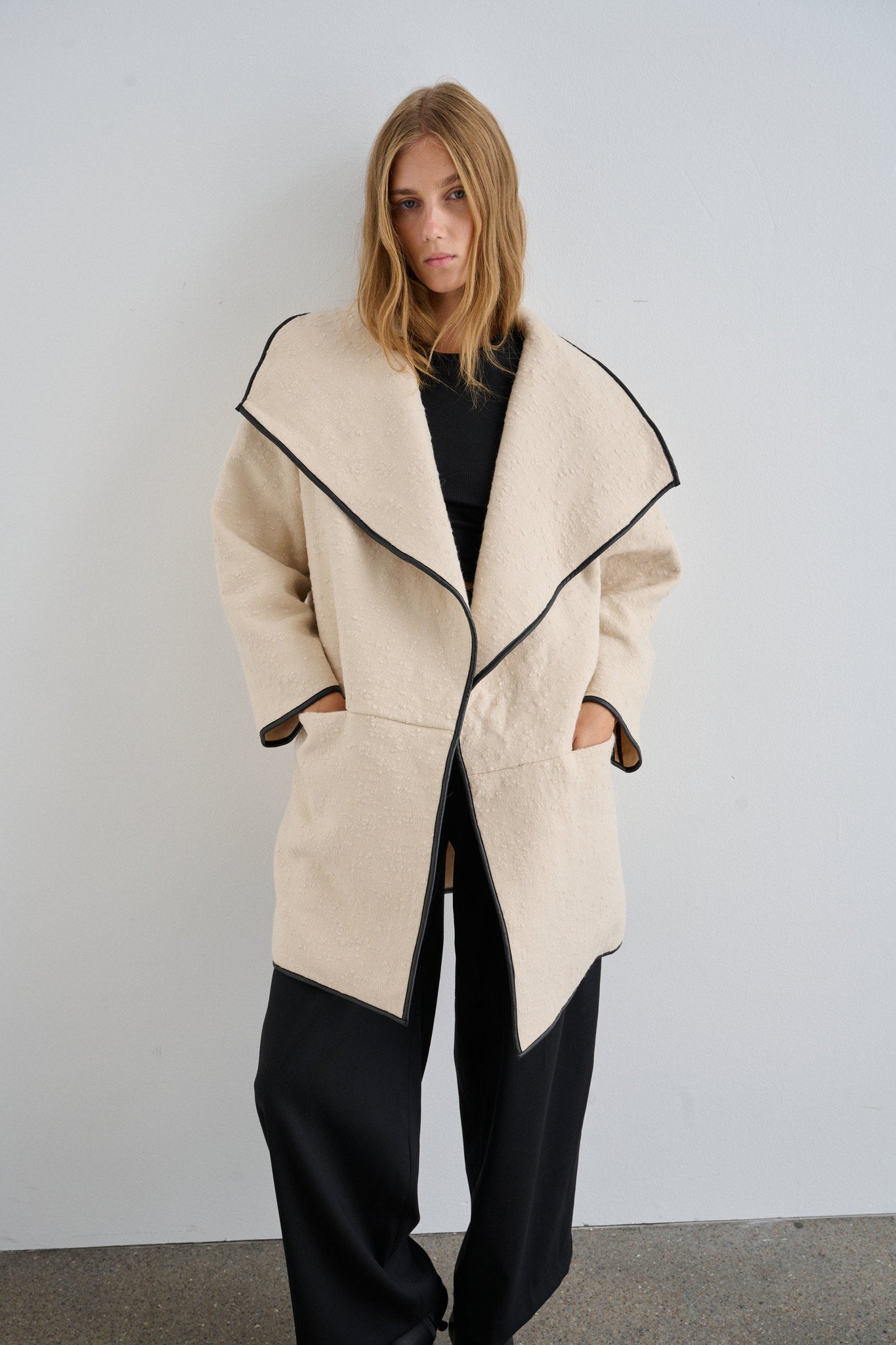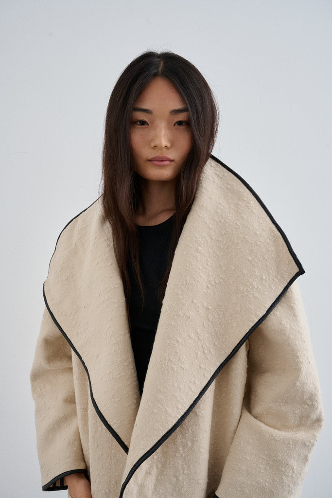 Crafted from Glúmur’s doublé fabric - a blend of responsibly sourced 100% wool, from an Italian fabric mill founded in 1848. The coat features an oversized silhouette with a draped collar, dropped shoulders, and an open front which makes it perfect for layering, then is complete with inseam pockets and side slits.